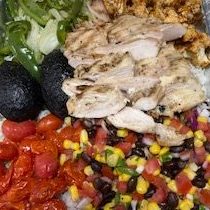 marinated cajun spiced chicken, cumin and poblano roasted corn, black beans and rice, southwest spiced squash, roasted pepper medley, chipotle and brown sugar sweet potato, served with a cilantro lime vinaigrette,