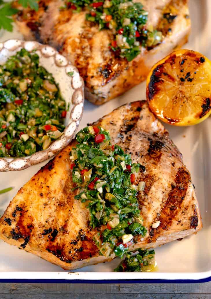 a nice meaty portion of fresh swordfish grilled with a delicious Olive Chimichurri sauce. Parsley, cilantro, green olive, red wine vinegar, fresno pepper, lemon, EVO, garlic,