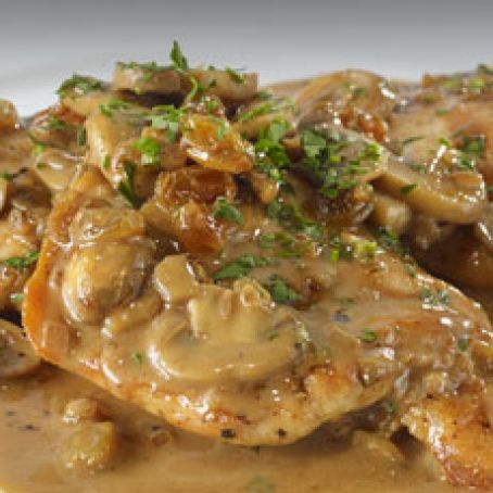 delicately seared chicken breast with a mushroom sauce made with chicken stock and a brown butter.